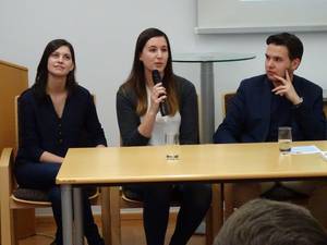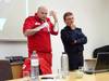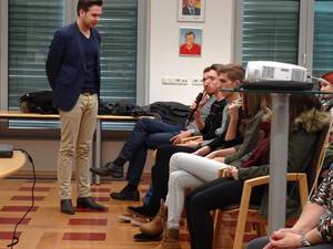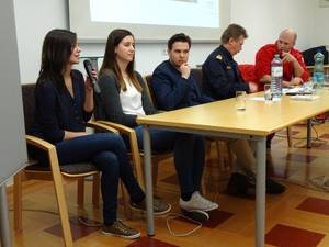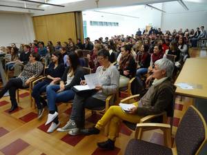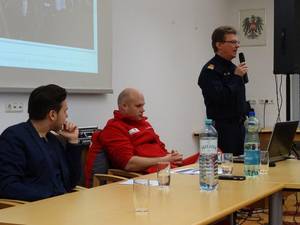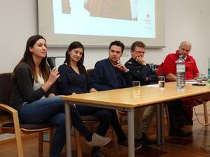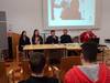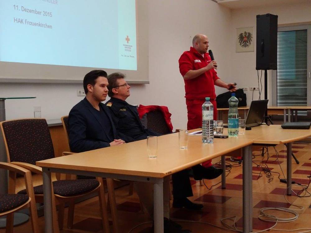 Auf Initiative von Eva Payrich aus der 5DK fand am 11.12. im Rathaus Frauenkirchen für alle Schüler/innen der BHAK/BHAS Frauenkirchen eine Diskussionsrunde mit je einem hochrangigen Vertreter von Rotem Kreuz und der Polizei statt. Mag. Tobias Mindler, zuständig für die Öffentlichkeitsarbeit des burgenländischen Roten Kreuzes und wichtige Kontaktperson für die internationalen Medien zur Zeit des Flüchtlingsstromes am Grenzübergang Nickelsdorf, berichtete von der Arbeit des Roten Kreuzes, das tausende erschöpfte, zum Teil kranke oder verletzte Flüchtlinge betreute. Er ging auch auf Aussagen und Gerüchte ein, wie sie in diversen Medien kolportiert wurden und die für Außenstehende oft schwer auf ihren Wahrheitsgehalt hin zu beurteilen sind. Oberstleutnant Helmut Marban, Leiter der Abteilung für Öffentlichkeitsarbeit in der Landespolizeidirektion Burgenland war zur Zeit der zahlreichen Flüchtlingsankünfte ebenfalls fast jeden Tag in Nickelsdorf. Er berichtete über die Arbeit der Polizei seit dem Herbst des Vorjahres. Ein Schwerpunkt war das Schlepperwesen, dem man mit der liberalen und geordneten Einreisemöglichkeit für Flüchtlinge entgegenzutreten versuchte. Marban betonte die gute Zusammenarbeit von Rotem Kreuz und der Polizei und zeigte sich sehr beeindruckt von der unermüdlichen Hilfsbereitschaft der vielen freiwilligen Helfer. Zwei von ihnen waren unsere Schülerinnen Eva Payrich und Sophie Sattler, die sehr bewegend von ihren Erlebnissen bei ihren oft zwölf Stunden dauernden Einsätzen an der Grenze erzählten. In der anschließenden regen Diskussion wurden unter anderem Themen wie Fluchtgründe und Herkunftsländer, Grundversorgung und Kosten, Grenzzäune, Lebensstandard der Flüchtlinge, Abschiebungsgründe und auch mögliche Terrorgefahr erörtert. Mindlers Botschaft: „Wir als Gesellschaft haben es in der Hand, wie wir die Situation meistern. Und: Angst ist der schlechteste Ratgeber!“ Schulsprecher Max Sipötz moderierte professionell und eloquent die Veranstaltung. Wir sind sehr stolz auf unsere engagierten Schüler/innen und hoffen, dass diese Veranstaltung einen wichtigen Beitrag auch zur künftigen Meinungsbildung geleistet hat und die Bereitschaft zur produktiven Auseinandersetzung mit dem Thema Flüchtlinge fördert. Prof. Gudrun Schreiber-Jankovits und Prof. Irmgard Todt